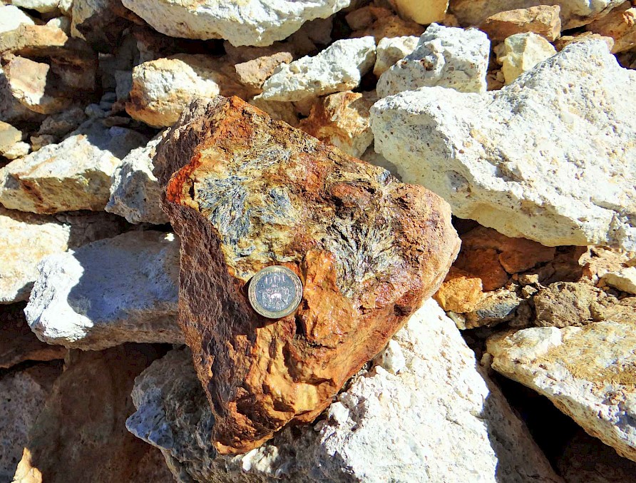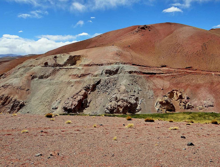 Both bulk tonnage and high-grade mineralization is found on the property, in two different areas. The southwest Manto Target near the Mina Vieja underground mine workings hosts oxide silver-manganese (lead-zinc-antimony-mercury) mineralization. The northeast Domo Target near the rhyo-dacite dome hosts high level silver (antimony-mercury-arsenic) mineralization. The target types are bulk tonnage, disseminated/stock-work, and/or high-grade silver vein, low sulphidation epithermal deposits within a Miocene volcanic caldera (examples include Pirquitas, Chinchillas, Cerro Potosi).