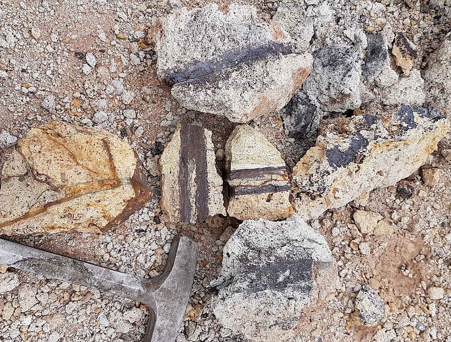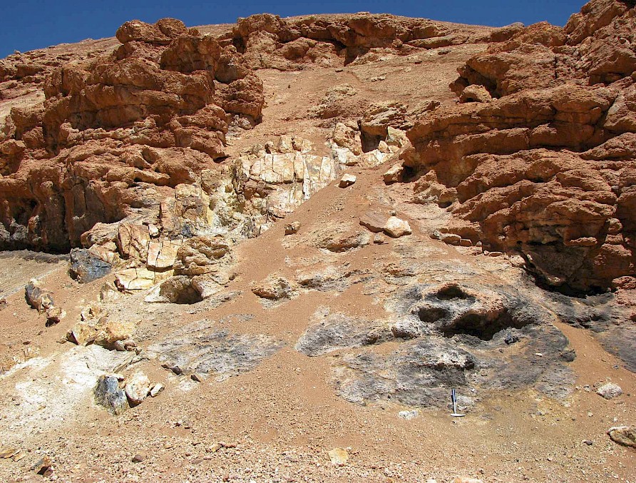 Aida covers a 4 km long x 2 km wide, argillic-phyllic-silicic alteration zone within dacite-andesite tuffs, breccias, flows, siltstones, sandstones and conglomerates intruded by a Miocene rhyo-dacite dome.